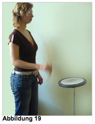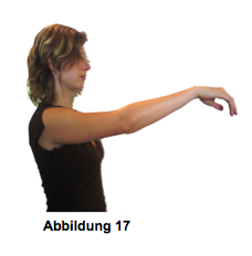 Man stellt sich aufrecht hin und hebt den Arm bis Schulterhöhe nach oben an. Dabei bleiben alle anderen Muskeln ganz locker, die für das Hochheben nicht nötig sind, die Hand hängt, der Ellbogen ist leicht gebeugt (Abbildung 17). Wenn man den Arm einige Zeit in dieser Stellung hält, wird man das Gewicht des Armes (zwischen 5 und 8 Kilo) deutlich spüren können und den enormen Kraftaufwand der nötig ist um den Arm dort zu halten. Eine Spannung entsteht zwischen der Erdanziehungskraft, der bereits genannten Schwerkraft und dem Halten durch die Muskeln (Schultermuskeln). Gibt man nun der Schwerkraft nach, erfolgt die Entspannung, wobei man die Schultermuskeln los- und den Arm fallen lässt. Der Arm sollte so lange auspendeln, bis er von selbst zum Stillstand kommt.