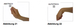 Mithilfe der „Zaunstreichbewegung“, lässt sich die Funktionsweise des Handgelenkes während eines Schlages verdeutlichen. Das Streichen geschieht durch eine Auf- und Ab- Bewegung des Handgelenkes (Abbildungen 21 & 22). Dabei folgt die Hand den Borsten des Pinsels. Beim Abstrich wird die Hand nach oben gebracht, beim Aufstrich nach unten. Handelt man diesem Grundsatz zuwider, sträuben sich die Borsten.